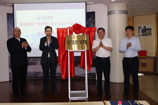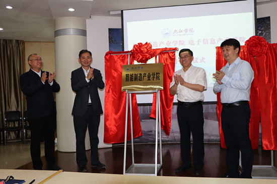 柯尊玉在致辞中对近年来九江学院在学科建设、人才培养、改革创新、科教融合创新及科研成果应用所取得的优异成绩表示高度地赞扬。他指出,九江经开区深入贯彻落实省、市党代会精神,锚定“决胜营收三千亿、奋进全国五十强”目标,启动实施“1+9”专项行动,对高端研发人才和高层次技术技能人才有着急切的需求。九江学院智能制造产业学院、电子信息产业学院的成立,将充分发挥“产、学、研、创、用”一体化平台的重要作用,强化校、企、地方三方合作,有效衔接教学科研和产业发展前沿的联动,实现产学研深度融合里程碑式的跨越,有力促进经济高质量发展。希望两个产业学院充分发挥九江学院专业人才优势、九江经开区产业优势、共建企业平台优势,培养一批支撑电子信息和智能制造产业的实用型技术技能人才,将两个产业学院打造成为创新基地、实践基地和科研成果转化基地,共同为九江打造新型工业重镇做出新的更大贡献!