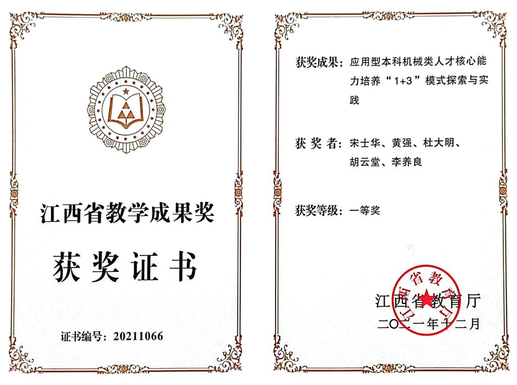 各产业学院不断推进政企校协同育人,提高学生的核心能力,近年来取得了丰富的校企合作育人成果,其中获江西省教学成果奖一等奖1项,二等奖2项;学生获中国国际“互联网+”大学生创新创业大赛铜奖3项,全国大学生机械创新设计大赛一等奖3项(位居全国第六),在中国大学生工程实践与创新能力大赛、全国大学生化工设计大赛和全国大学生电子设计大赛中摘金夺银并位居全省前列;学生以第一作者发表论文100多篇,以第一完成人授权发明专利和实用新型专利60多项,设计新产品或新装备10多个;“九江天赐订单班”学生毕业后100%进入合作企业工作,其中部分学生已担任企业技术和管理骨干。
