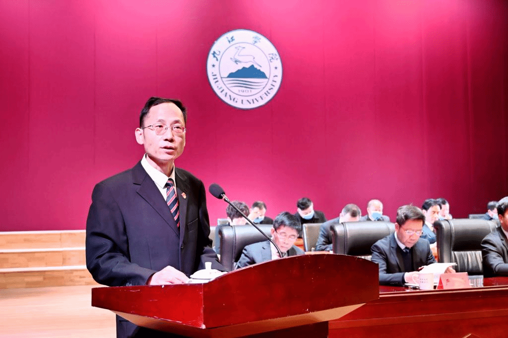 陈小林代表学校向大会作题为《凝心聚力决战申硕攻坚 踔厉奋进加快应用转型 奋力谱写九江学院高质量跨越式发展新篇章》的工作报告。