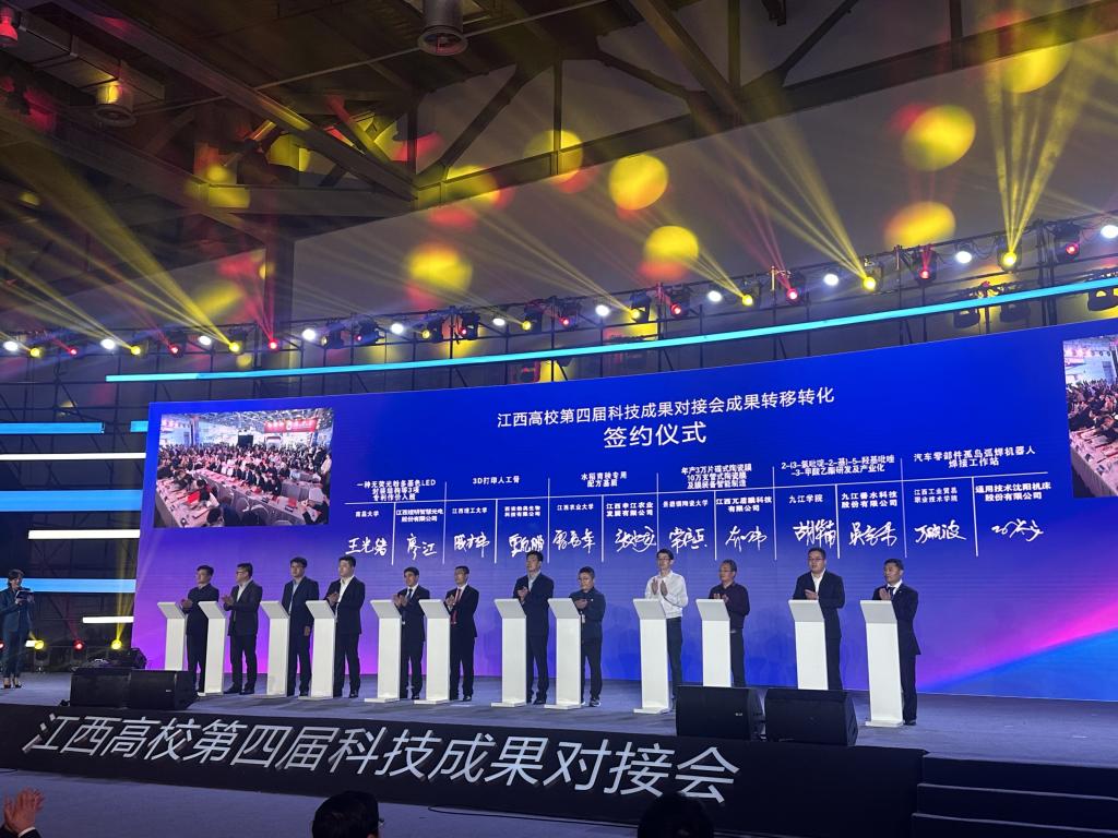 成果对接会期间,我校作为“第二批江西省高校科技成果转化和技术转移基地”应邀参加授牌仪式。在仪式上,我校化学化工学院胡华南博士、材料科学与工程学院王洪涛博士代表九江学院与九江善水科技股份有限公司、崇义章源钨业股份有限公司现场签约,签约金额550万元。