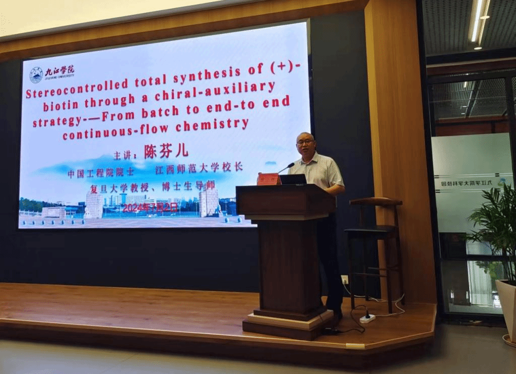 报告会上,陈芬儿院士以(+)-biotin(维生素H)为例讲述了一个中国研究团队突破国外技术垄断的故事。在半个多世纪前,维生素H的合成技术一直由瑞士罗氏公司(Roche)所垄断。在2001年,陈芬儿研究团队进行技术攻关,首创天然维生素H催化生产新工艺并产业化,打破国外公司的垄断,创造了巨大的经济效益与社会效益。近年来,陈芬儿院士研究团队又首个从介环酸开始,运用十三步的微通道连续流不对称全合成制备维生素H的方法,实现科学技术创新,该成果在国际上处于领先水平,为微通道连续流技术在药物合成中的进一步应用提供了示范。