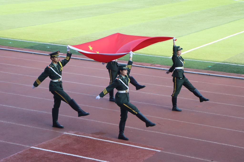 伴随着国旗队矫健的步伐,庄严的国歌声响起,全体师生注目礼下,鲜艳的五星红旗徐徐升起,迎风飘扬。