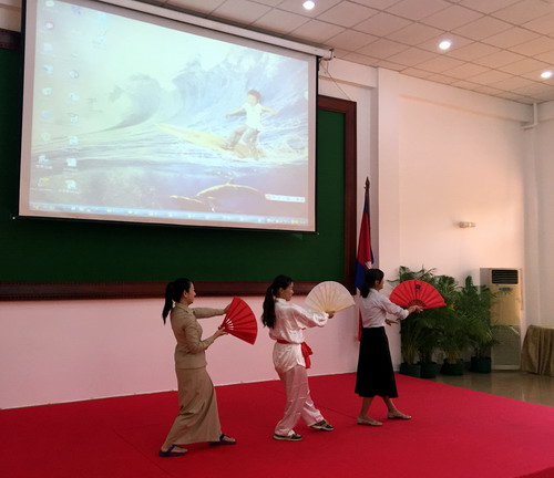 来自九江学院的公派教师张文峰通过精心准备的幻灯片向在场嘉宾及学员一一展示并生动讲解了中国传统节日,春节、清明节,并将中国的传统节日与柬埔寨的相关节日作比较,让学员们更加直观地了解了中国文化。孔子学院汉语教师志愿者宋亚洲、朱赞赞、王虎(柬方)共同展示了中国功夫。