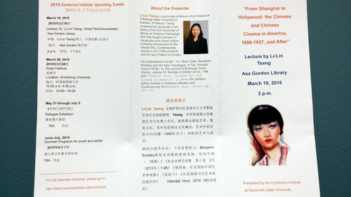 3月19日下午,萨凡纳州立大学孔子学院邀请了堪萨斯州匹斯堡州立大学艺术史副教授Li-Lin Tseng 博士给孔子学院的师生带来了一场关于中国电影文化的讲座。萨凡纳州立大学孔子学院中外方院长、汉语教师及学生40余人参加了这次活动。讲座由孔子学院工作顾问委员会成员Niranjan Suman博士主持。