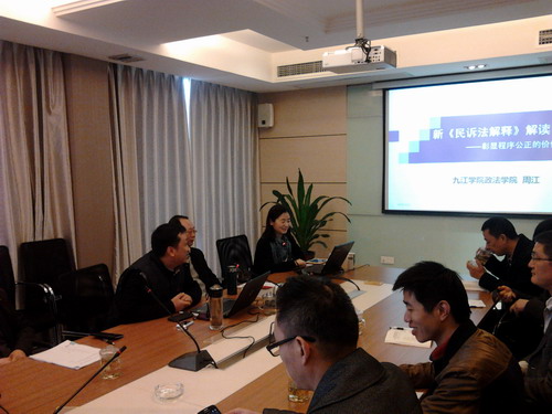 3月21日上午9:00时至下午18时,应九江市浔阳区人民法院的邀请,政法学院周江老师在九江市恒盛科技园会议厅,为该院开发区法庭及官牌夹法庭的法官讲解《民事诉讼法》新司法解释。
