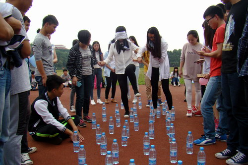 此次趣味活动有“连环爆炸”、“坐地起身”、“穿越火线”、“五人四绳”四个项目。首先进行的是“连环爆炸”项目,每班各派10名同学来回一百米接力并吹爆气球,让大家体验了竞争的乐趣。指挥队友越过矿泉水瓶搭成雷区的“穿越火线”游戏,双手不撑地起立的“坐地起身”以及竞速“五人四绳”游戏,都是非常考验队友之间的默契与配合。参与活动的同学都是临时组队,不仅玩得开心还结识了很多新朋友,增进了相互交流的机会。