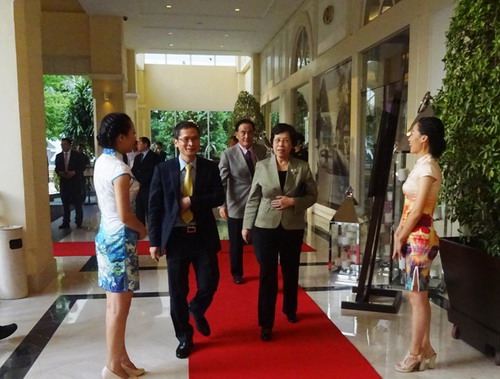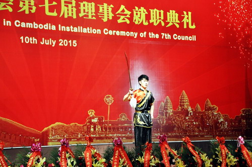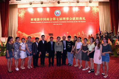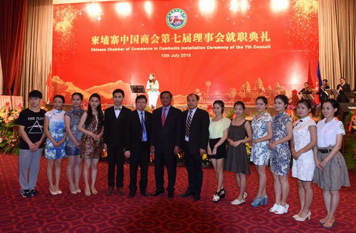 7月10日晚,柬埔寨中国商会在索菲特大酒店举行第七届理事会成立暨理事就职庆典。柬埔寨副总理兼内政部长苏庆亲王(Sar Kheng),副总理严才利(Yim Chhay Ly),商业部长孙占托(Sun Chanthol),工业与工艺部长蒲拉西(Cham Prasidh),旅游部长唐坤(Thong Khon),中国驻柬大使布建国夫妇,政务参赞檀勍生、商务参赞宋晓国等柬政府各部委代表、华社各界代表约500人出席。杜平福、黄金玲以流利的汉语,优雅的礼仪贯穿着整个典礼全过程。