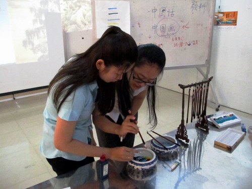 7月17日,柬埔寨王家研究院孔子学院在孔子学院二楼影音室举行“每周中国文化活动”之中国国画文化讲座。为了让孔子学院的更多学生了解和体验到中国文化,此次的“每周中国文化活动”时间改为11点——12点。本次讲座的主讲者为九江学院选派的孔子学院汉语教师志愿者周亚莉,孔子学院师生代表共50余人参与了此次活动,柬埔寨新闻频道(CNC)全程录播。