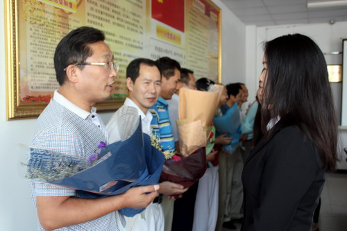 座谈会开始前,政法学院学生代表向高教教龄30年以上的教师鲜花。