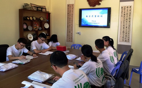 帅式毅院长指出,汉语教师志愿者要努力改变自己以尽快适应到新的工作、生活环境。他着重就志愿者的本质工作——中柬语言、文化交流进行了以《教学质量控制》为主题的讲座。其中包括柬埔寨学生的基本情况与特点;志愿者在赴任期间应当遵守的孔子学院各项规章制度;教学方法、技巧,因地制宜地在中柬文化对比中进行生动教学;以及严格遵守孔子学院制定的教学要求,如详细的教学计划、听课任务。各个教学点的负责人及志愿者教师应做好教学管理工作:合理规划好教材、教案的编写,重大教学活动与文化活动的举行,教学进度的监控,以及考试的反馈等;定期举行教学研讨会;积极参加摄影展与新闻投稿活动。最后,帅院长就新闻编写工作进行了说明,并规范新闻编写形式及新闻图片的压缩处理技巧等。会后,帅院长就志愿者教师提出的问题进行了解答。