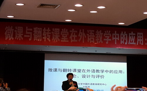 课程伊始,北京外国语大学学术委员会主任、教授、博士生导师文秋芳老师提纲挈领地界定了本次研修班的讨论范围,即服务于翻转课堂的微课以及基于微课的翻转课堂。其后,文老师明确指出微课与翻转课堂应该有效衔接,课前与课上有机结合,才能够促进知识的活用与内化吸收。文老师结合其他专家对于微课与翻转课堂的看法,认为微课对于同行交流,提高教师的教学水平和专业能力有很大的促进作用,“聪明的老师把别人的微课作为自己学习的样本”。