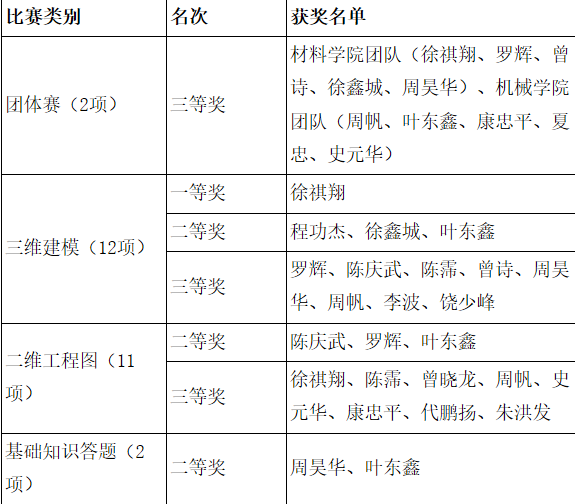 全国大学生先进成图技术与产品信息建模创新大赛规模大、水平高、参赛人数多,是最具影响力的全国性大学生赛事之一。赛制分为团体、个人三维建模、二维工程图和基础知识答题四项。本次比赛共吸引了来自南昌大学、江西理工大学、华东交通大学、南昌航空大学等53所院校参加,参赛学生人数达800余人,竞争非常激烈,团体奖只有37%的获奖比例,个人单项奖仅有30%的获奖比例。