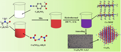 论文以4-氰基苯甲酸为有机配体通过水热法合成了一种前驱体Co-MOF,并对其在不同温度下进行退火处理得到了一系列致密的Co3O4/NC多孔纳米材料。将其作为锂离子电池负极材料时,Co3O4/NC-2表现出较高的可逆比容量和优异的倍率性能。Co3O4/NC-2优异的电化学性能得益于不同组分的协同作用及其稳定的纳米结构。因此,Co3O4/NC-2作为高性能储锂负极材料有着很高的应用前景。