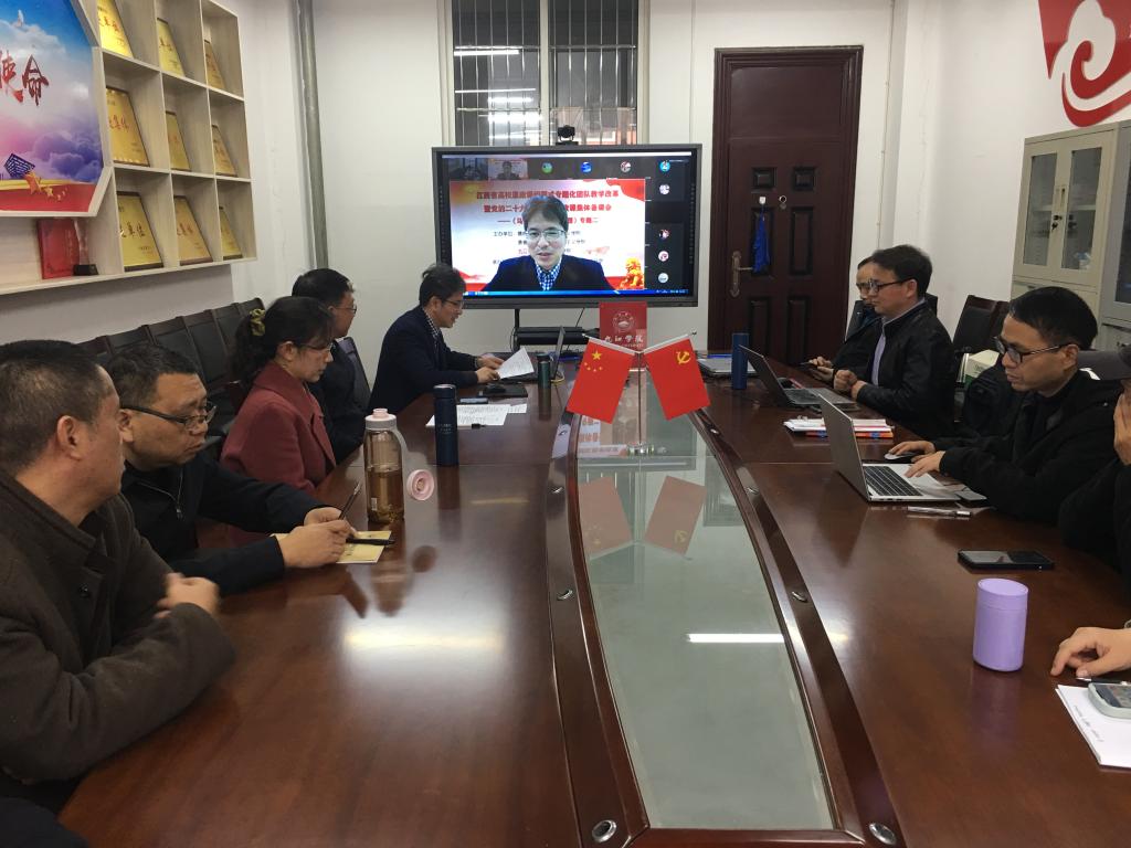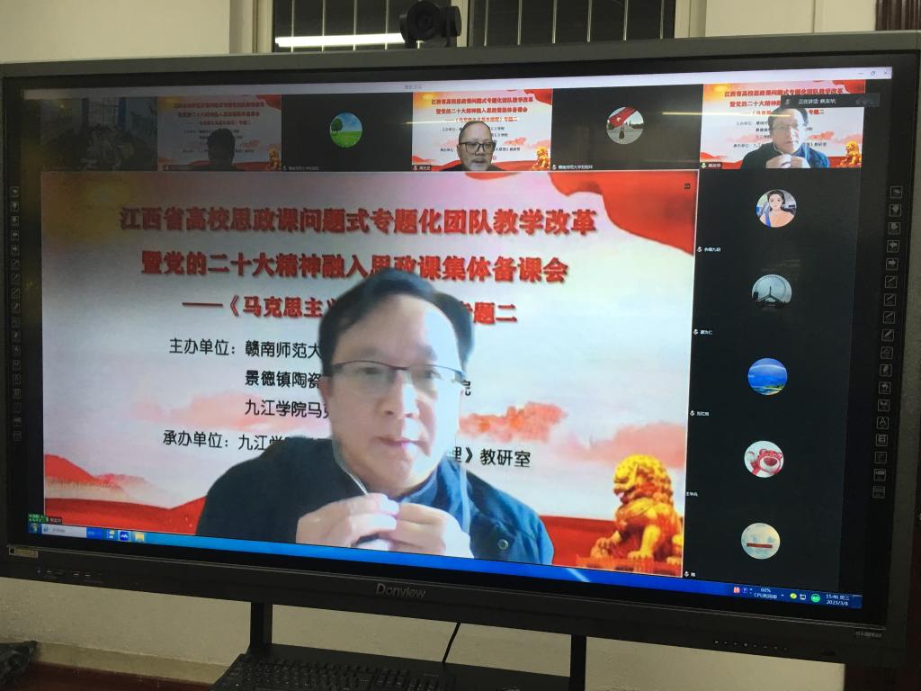 为深入学习贯彻党的二十大精神和习近平总书记在学校思想政治理论课教师座谈会上的讲话精神,进一步推进“大思政课”试验区建设,提高思政课教学效果,在中共江西省委教育工委宣传部、江西省教育厅社政处的统一指导下,3月8日下午,我校马克思主义学院举办了全省高校《马克思主义基本原理》课(专题二)问题式专题化团队教学改革暨党的二十大精神融入思政课集体备课会。我校全体《原理》课程主讲教师、赣南片区、景德镇片区、九江片区等高校近100位《原理》课教师线上线下参加会议。教育部全国高校思政课教指委“马克思主义基本原理”分教指导委员、湖北大学马克思主义学院院长熊友华教授出席线上视频会议,并作指导点评。