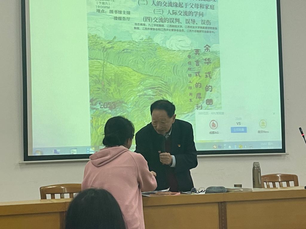 “与人交流一定要看对方的眼睛”,陈忠教授通过分享中国外交官交流的事例和感悟,向学生们阐述了交流礼仪,强调了人际交往中真诚的重要性。讲座最后,陈教授向学生们赠送书籍,殷切期望同学们做新时代有理想、有道德、有文化、有纪律的好青年。