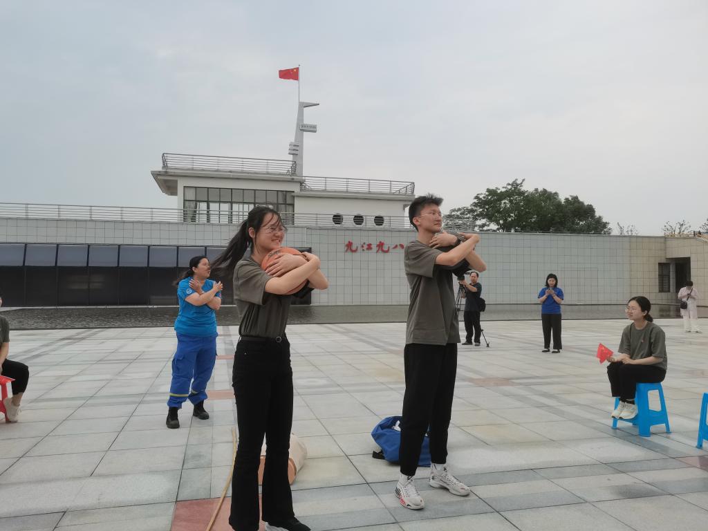 在九江九八抗洪展陈馆,运营负责人、校友曹雨晴带领同学们参观了六个展区,其中沉船堵口最为惊心动魄。在九江九八抗洪展陈馆这座煤船造型的建筑前,同学们齐心协力模拟开大船的情景,在守望相助中体验抗洪英雄力挽狂澜的壮举,致敬前辈舍生忘死的英雄气概。