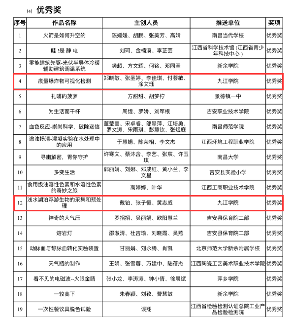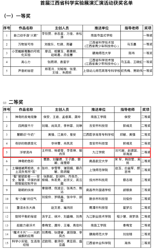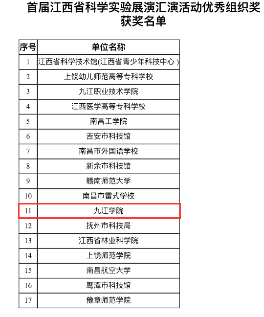 近日,首届江西省科学实验展演汇演活动评选结果揭晓并公示,我校3支代表队与来自省直单位、高校、科研院所、医院136支代表队的552名选手同台竞技,夺得了一个二等奖和两个优秀奖的佳绩,充分展现了我校学子用心进取、团队协作的科学精神和优秀的专业素养、心理素质以及创新能力。九江学院获优秀组织奖。