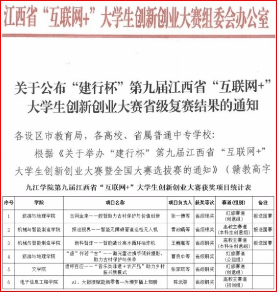 9月5日,“建行杯”第九届江西省“互联网+”大学生创新创业大赛暨全国大赛选拔赛成绩全部出炉。我校师生在本项大赛中勇创佳绩,获省赛银奖2项和铜奖4项的团体佳绩,其中3个项目推荐进入全国总决赛。
