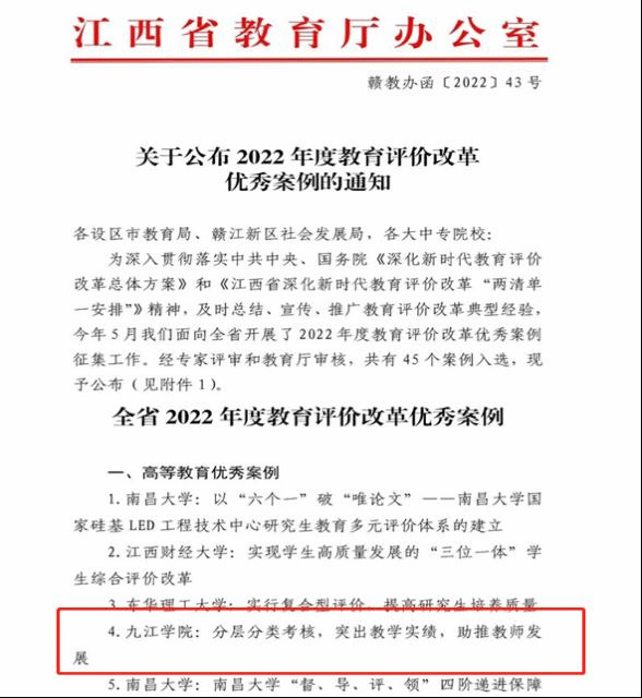 学校按照《深化新时代教育评价改革总体方案》精神和我省“两清单一安排”要求,以深化新时代教育评价改革为引领,提高政治站位,强化责任担当,结合学校实际,改革教师评价,从师德师风、教育教学实绩、教师科研评价、教师育人成效等四个方面,形成了“四位一体”的九江学院教师教育教学实绩评价方案,2021年获批江西省教育评价改革第一批试点单位,《教师教育教学实绩评价》获得首批试点项目。2022学校推送的《分层分类考核,突出教学实绩,助推教师发展》案例成功入选江西省教育评价改革优秀案例,江西教育电视台对我校教育评价改革工作进行了专访。