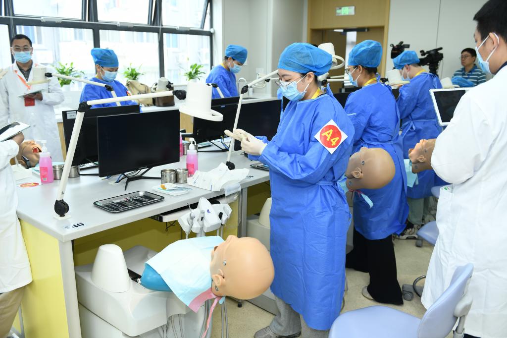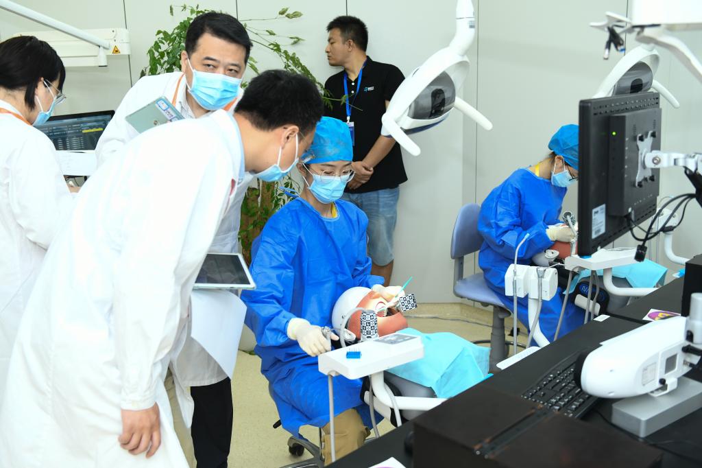 比赛精心设置了“II类洞制备术、牙槽突黏膜切口缝合术、全瓷冠牙体预备术、心肺复苏+AED急救技术”四个竞赛项目,同时结合信息化、数字化手段,应用导航式仿真训练系统、牙科仿真操作训练系统、客观化结果评估系统、无纸化考核评分系统等国内先进的教学评估手段,确保了比赛的公平性、公正性、客观性。选手们个个精神饱满,斗志昂扬,凭借扎实的理论基础、精湛的操作技艺和卓越的团队协作能力,尽现卓越风采。