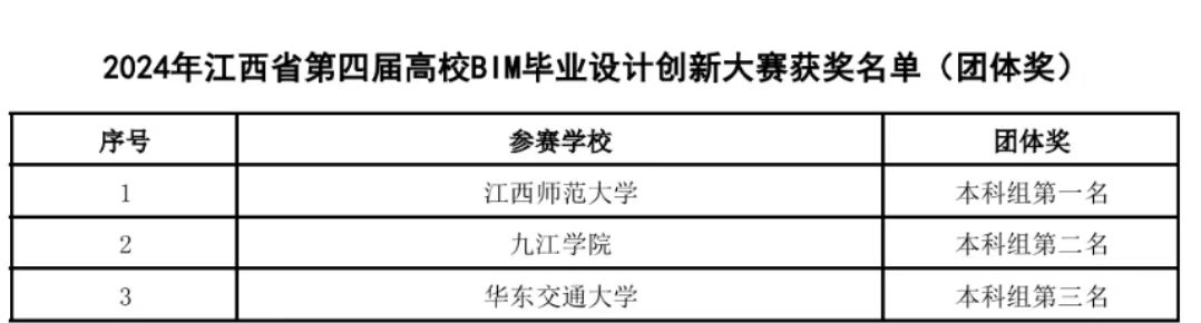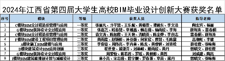 近日,我校建工学院学子在多项学科竞赛中斩获佳绩。在第四届江西省大学生高校BIM毕业设计创新大赛中,斩获一等奖2项、二等奖2项,三等奖4项,总成绩连续三年位居省内本科院校参赛队第二名;在第八届江西省大学生结构模型设计大赛中,获二等奖一项、三等奖一项;在江西省第12届未来设计师高等数字艺术设计大赛中获得三等奖一项。