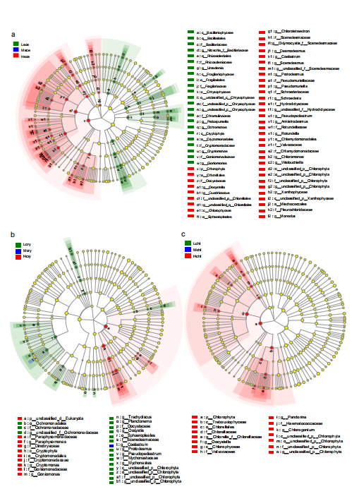图1 基于LEfSe分析的不同微藻分类中的真核藻类Biomarker。不同丰度Scenedesmus和Desmodesmus(a),Cryptomonas(b),Chlorella(c)中的藻类Biomarker。