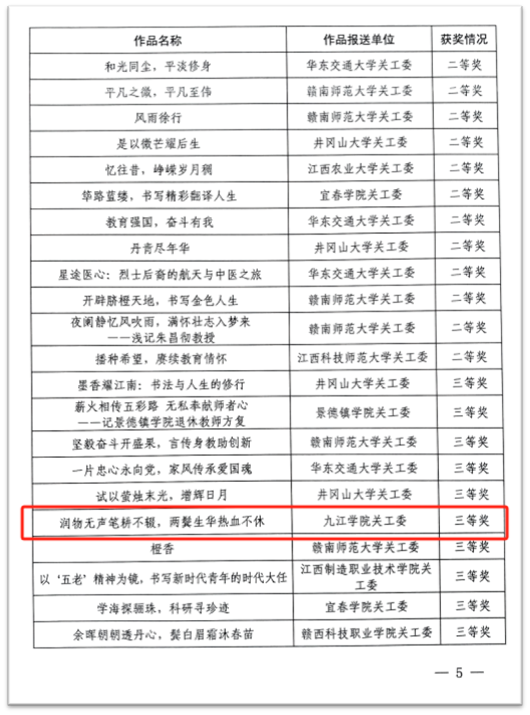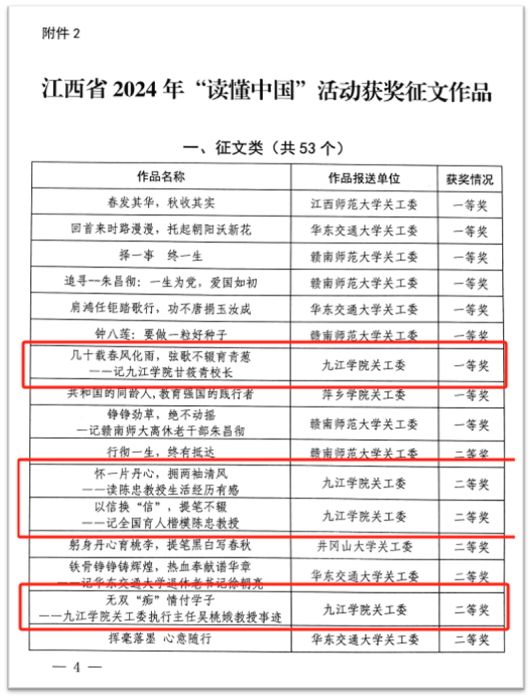 同时,江西省教育厅关工委公布了2024年我省高校“读懂中国”活动评审结果,我校参赛的14篇征文作品中9篇获奖和2个微视频作品全部获奖,微视频获奖率高达100%,征文获奖率达64.2%,其中,文学院选送的《几十载春风化雨,弦歌不辍育青葱》获征文类一等奖,护理学院、旅游学院、文学院、材料科学与工程学院、基础医学院、计算机与大数据科学学院等选送的作品分别荣获二、三等奖,基础医学院选送的《承前人之志,启后世之师——白大褂下的使命感》获微视频类一等奖,文学院选送的《老骥伏枥,立德树人》获微视频类二等奖。