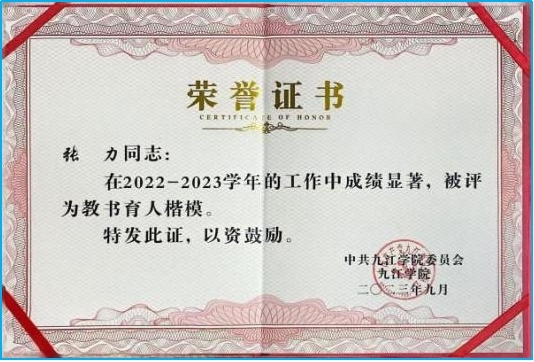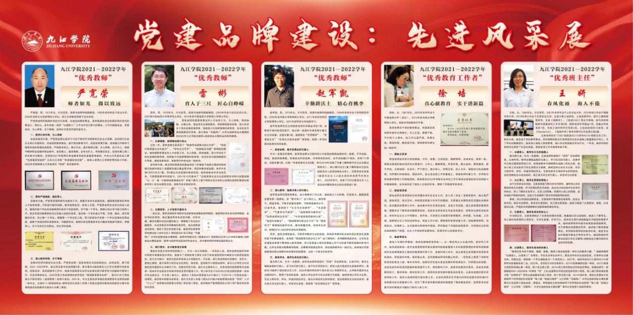 教工第二党支部2021年荣获全省教育系统“先进基层党组织”和九江市直机关工委“先进基层党组织”称号;2022年荣获九江市直单位“四强”党支部称号、九江学院“四强”党支部称号;2023年获批江西省首批“全省党建工作样板支部”;2024年获批第四批“全国党建工作样板支部”培育创建单位、全国高校“双带头人”教师党支部书记“强国行”专项行动团队、九江学院“先进基层党组织”称号。