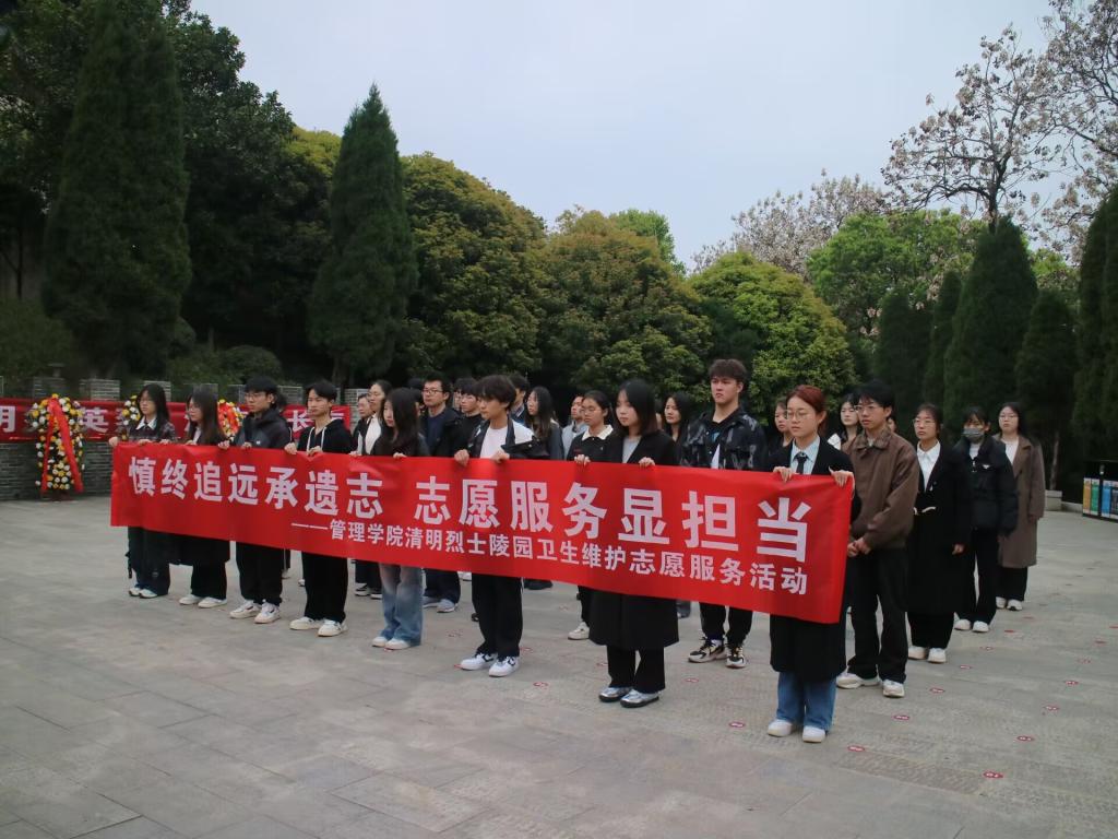 4月4日清晨,管理学院组织40余名学生代表徒步前往九江市革命烈士陵园,开展“慎终追远承遗志,志愿服务显担当”祭扫英烈活动。在庄严肃穆的烈士陵园,同学们向革命烈士敬献花篮、集体默哀、重温入团誓词,随后分组擦拭烈士墓碑、清扫落叶。此次往返步行,不仅践行低碳理念,更让同学们深刻体会革命先辈的艰辛,大家表示将传承先烈遗志,为社会贡献力量。