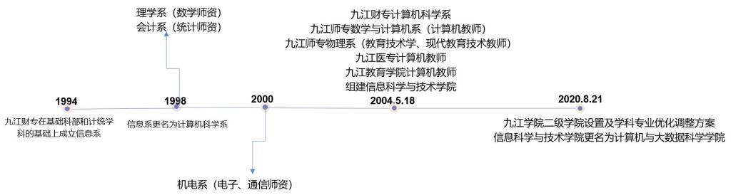 计算机与大数据科学学院是2004年四校实质性合并组建时由原九江财经高等专科学校(中国人民解放军军需高等专科学校)计算机科学系、原九江师范高等专科学校数学与计算机系、物理与信息工程系进行学科整合组建而成。学院现有教职工118人,具有高级职称的教师34人,其中教授5人,具有中级职称的教师76人,92%的教师具有硕士以上学位,具有博士学位的教师27人,博士后出站人员3名,硕士研究生指导老师20名,4名省(部)级中青年骨干教师,2名市级高层次人才,2名“教书育人楷模”,84名“双师型”教师,国内外访问学者6名。柔性引进1名高端人才--香港城市大学智能计算讲座教授、IEEE Fellow、长江学者。聘任20多名企业工程师及行业专家为兼职教师,聘任6名行业领域专家、工程师或项目负责人担任“第二班主任”,聘任1名校外辅导员。