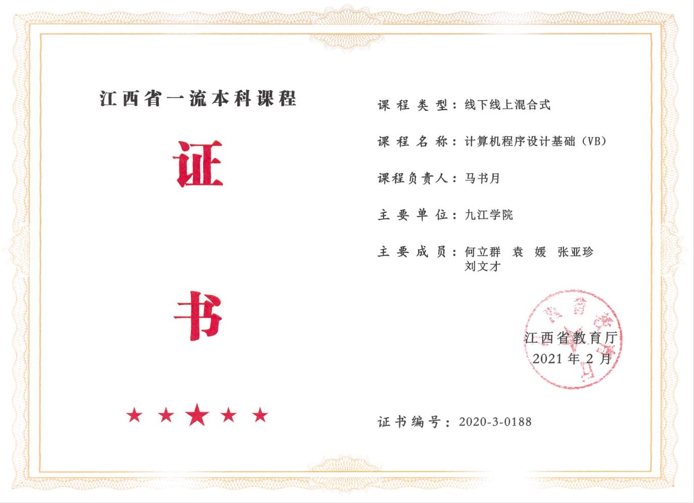 图3-4《计算机程序设计基础(VB)》一流课程证书