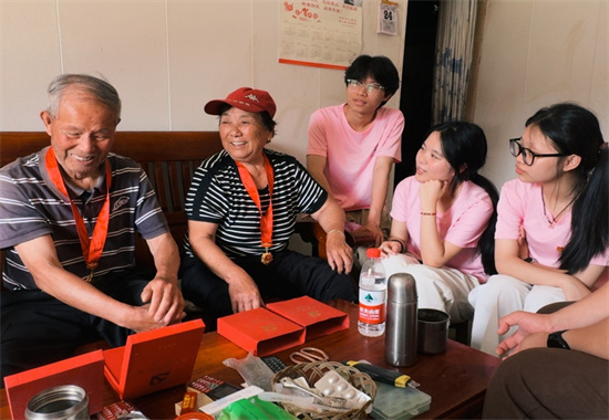 6月27日,团队走访慰问流芳乡老党员徐贤林、刘菊花夫妇。有着63年党龄的徐贤林同志讲述带领村民垦荒拓田、筑渠引水的奋斗历程,52年党龄的刘菊花同志分享担任生产队队长期间的实干经历。老党员夫妇展示“光荣在党50年”纪念章,并寄语青年学子珍惜当下、努力学习、为党和人民贡献力量。这次走访是一场跨越半世纪的精神对话,让红色基因在青年心中生根发芽,激励学子传承徐贤林、刘菊花夫妇“坚守初心、实干为民,不畏艰难、勇于担当”的精神。