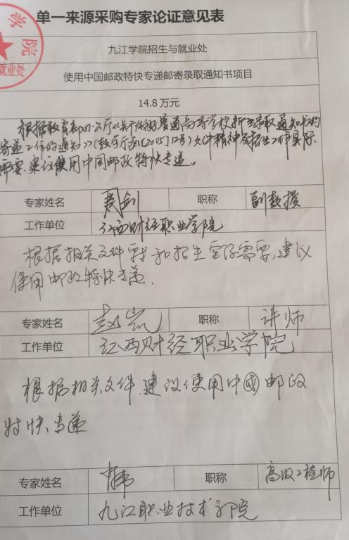 我校拟采用单一来源方式采购邮寄服务项目,现将采购项目有关情况向潜在供应商征求意见(采购项目有关情况见后文),潜在供应商对公示内容有异议的,请于公示期满后一个工作日内以实名书面(包括联系人、地址、联系电话)形式将意见反馈至九江学院招投标采购管理办公室(地址:九江市庐山区前进东路551号,联系人:张艳军,联系电话:0792-8311203)。