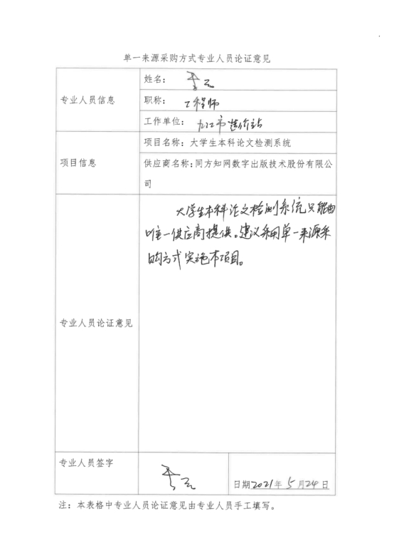 采用单一来源采购方式的原因及说明:“大学生本科论文检测系统”是由同方知网数字出版技术股份有限公司自主研发,符合政府单一来源情形,建议采用单一来源采购方式,由同方知网数字出版技术股份有限公司负责实施。
